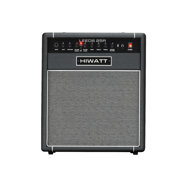 Il combo per chitarra Leeds 25R di casa Hiwatt produce il classico suono britannico, con toni puliti e un headroom elevato. Questo amplificatore transistor ha due canali, Clean e Overdrive, ed è equipaggiato con un riverbero a molla, un loop effetti ed è compatibile con i pedali Hiwatt. La potenza di 25 watt lo rende ideale per piccoli locali, per lo studio o per esercitarsi a casa, il tutto in un case compatto e comodo da trasportare. Sul pannello frontale troviamo i controlli Gain, Contour, Volume Crunch, Volume Clean e Spring Reverb, oltre alla sezione EQ a tre bande con le manopole Bass, Middle e Treble. Frontalmente è presente anche lo switch per il cambio canale. Sul retro il Send e il Return sono accompagnati dall'uscita speaker (4-8 Ω) e dal jack dedicato al footswitch, che consente il cambio canale e l'attivazione del riverbero. Monta un cono da 10".