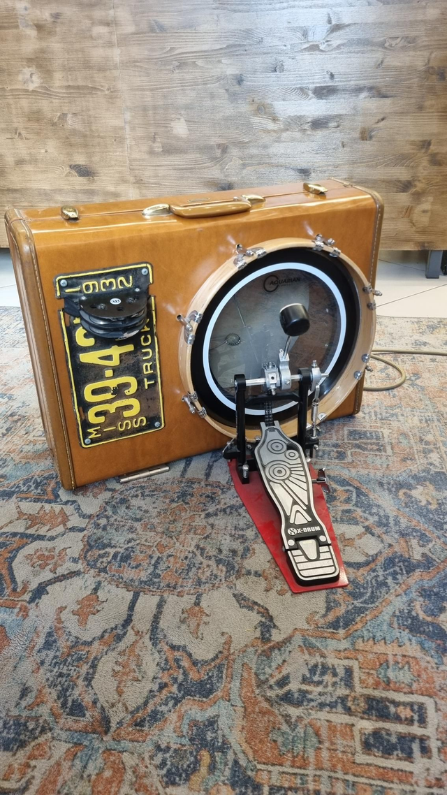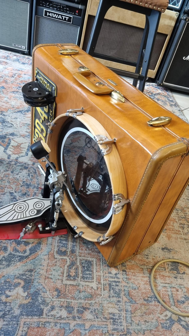 Questa valigia vintage Samsonite a grandezza naturale degli anni '60 è MOLTO RARA. Vanta una grancassa da 16" con una targa vintage del Mississippi come rullante. L'effetto è incredibile e aggiunge davvero molta profondità al suono generale. È dotata di una pelle Aquarian Super Kick con anello di smorzamento installato per conferire un punch corto e profondo. Questo tamburo ha decisamente una certa potenza.